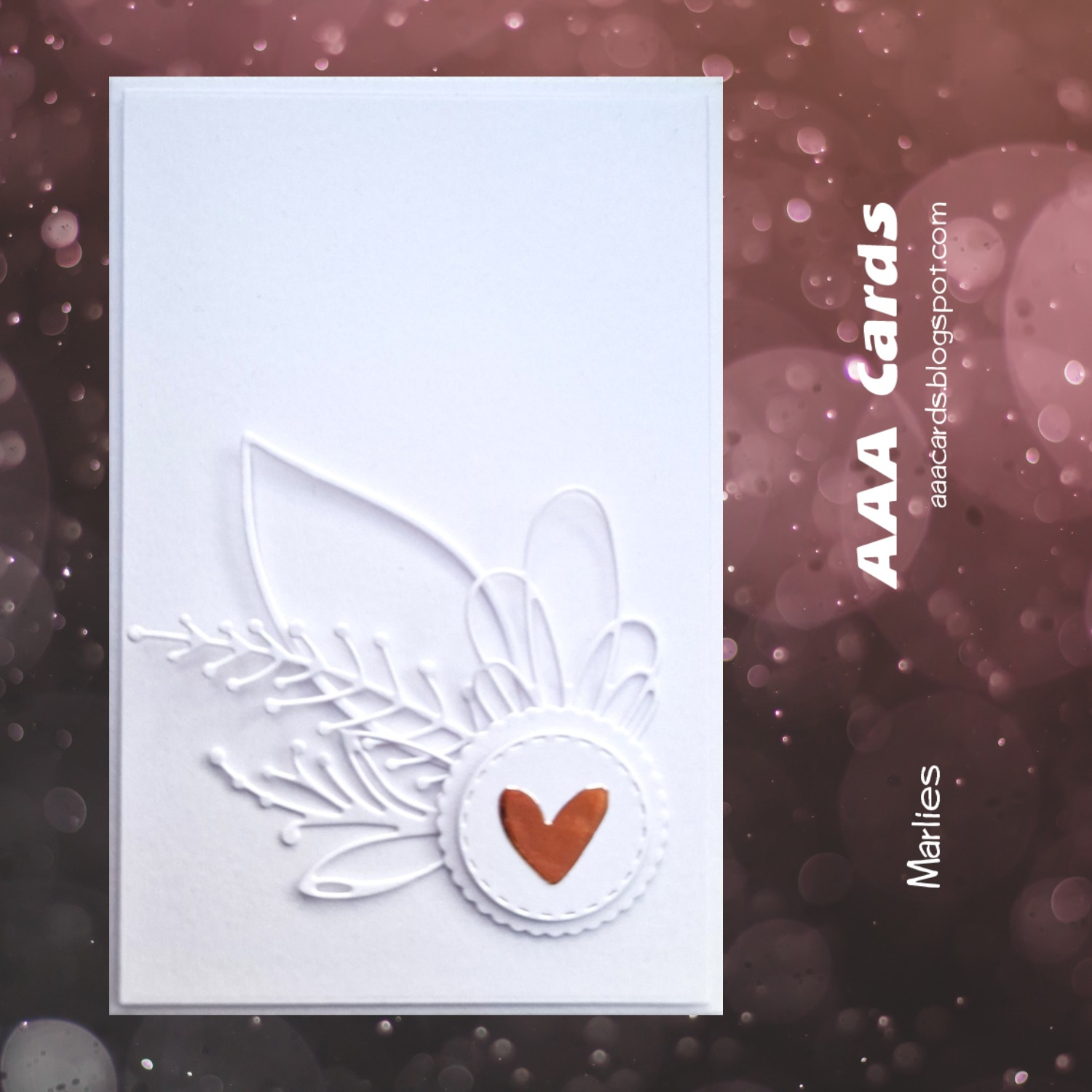 I'm slowly getting back to my routine after the holidays. I'm enjoying my crafty time. We have a new clean and simple challenge at AAA Cards. Our challenge this time is to take our inspiration from a Design Team member, Marlies. Here is the link to her blog and here is her card.